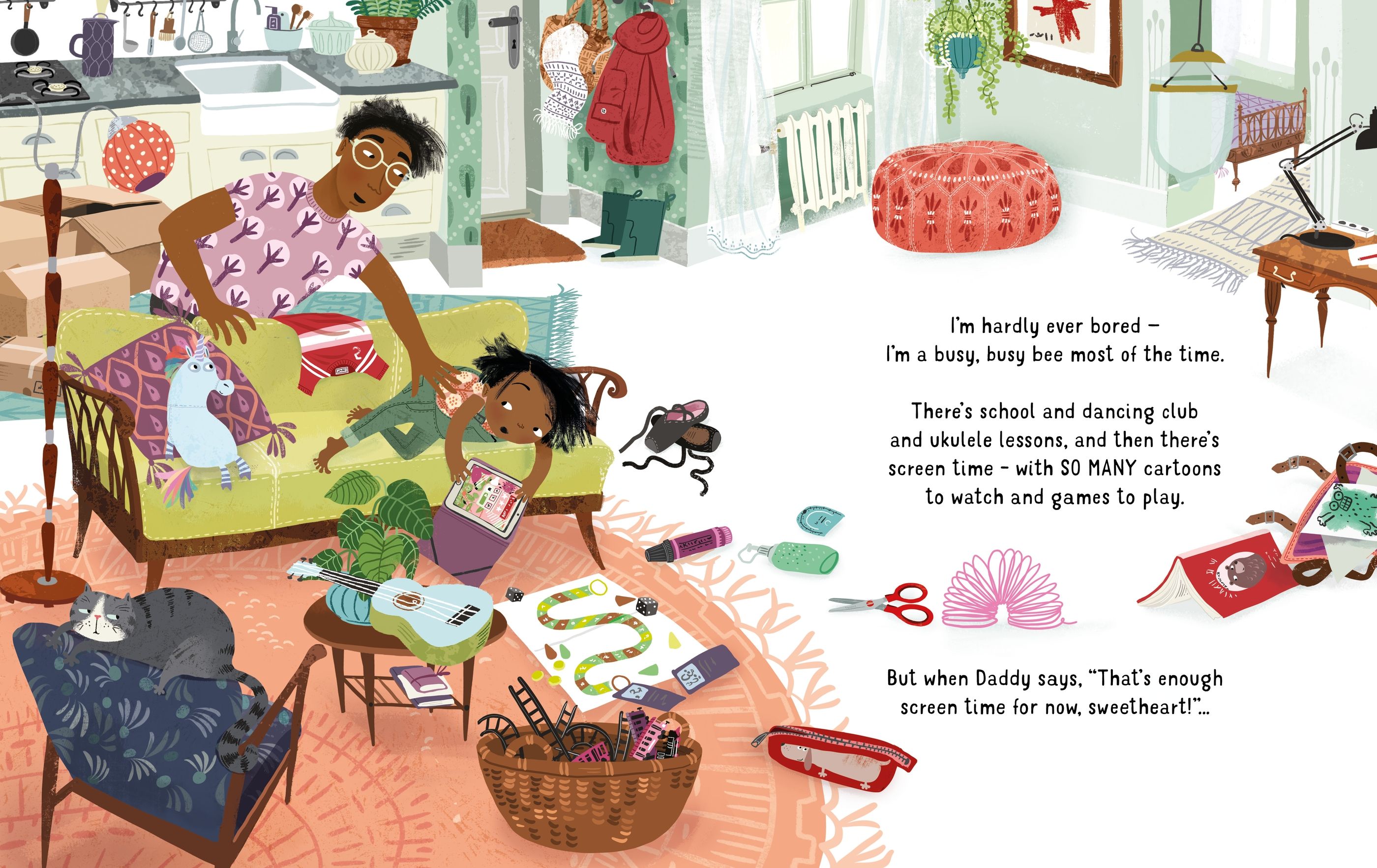 «¡Estoy aburrido!» se lamenta una niña después de que su tiempo frente a la pantalla se acorta. «¡Genial!» dice su padre con una sonrisa. «Estar aburrido viene justo antes de tener una muy buena idea». Después de una protesta inicial, la niña se sumerge en su imaginación y lleva al lector con ella en un torbellino de pura diversión. Una caja de cartón se convierte en un tren mágico, la lavadora inspira un viaje imaginario al espacio, un garabato garabateado se convierte en un monstruo de espagueti hambriento y las hormigas en el jardín la llevan a una escapada en el Funny Bug Circus. En un mundo donde los niños pueden encontrar entretenimiento con solo tocar un botón, es cada vez más importante que tengan tiempo para aburrirse, porque ahí es donde tienen el espacio para generar sus propias ideas realmente buenas.