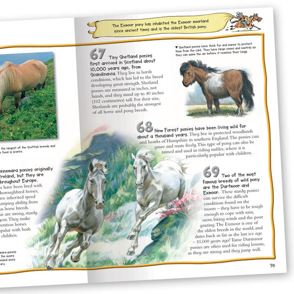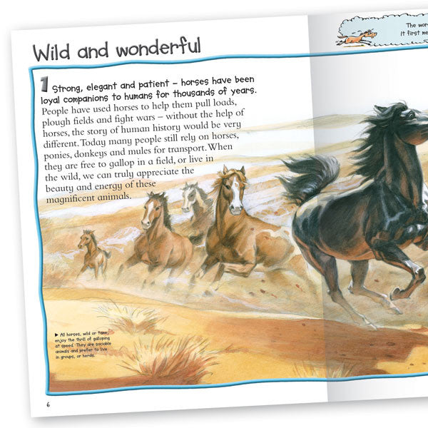 100 Facts Horses and Ponies incluye temas clave sobre estos mamíferos con pezuñas en simples hechos numerados. Cada página presenta bellas ilustraciones y fotografías que apoyan la comprensión del texto por parte de los niños. Este título de no ficción es un libro de caballos perfecto para niños mayores de 7 años que quieran aprender más sobre estos majestuosos animales.