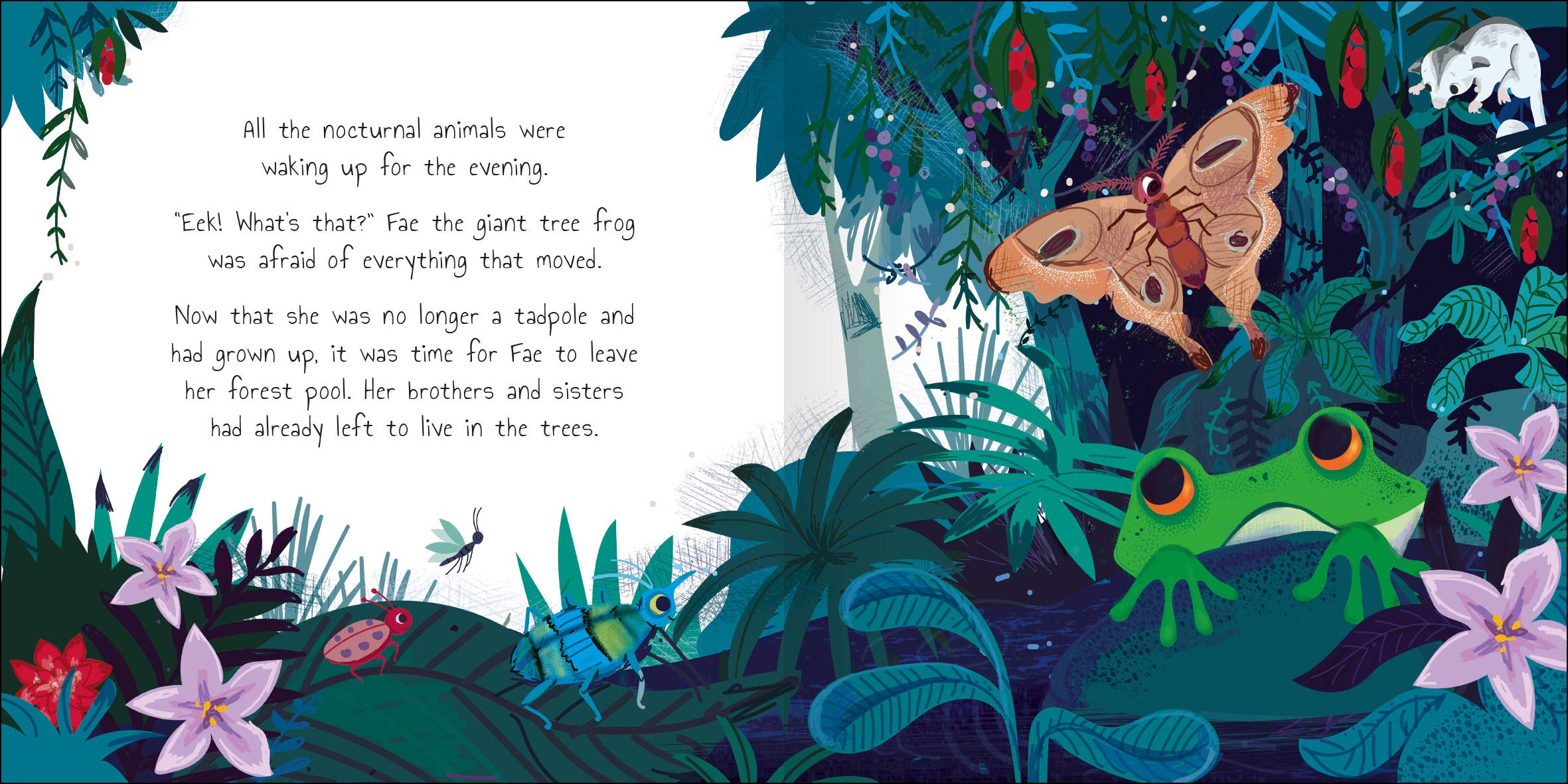The Timid Frog es un hermoso libro ilustrado para niños pequeños a partir de 3 años que presenta a Fae, la rana arborícola gigante, que vive en las selvas tropicales de Australia.
